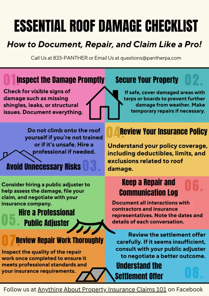 Dealing with a roof claim can be challenging, but Panther Public Adjusting is here to guide you every step of the way! 🏠✨ Start by thoroughly documenting all damage with high-resolution photos and detailed notes. If immediate repairs are necessary, ensure they’re done safely and consult with a professional to avoid compromising your claim. Understanding your insurance policy and promptly reporting the damage to your insurer is crucial for a smooth process. 🕒📞 For expert assistance, hire a public adjuster to handle your claim, negotiate with the insurance company, and maximize your settlement. With our expertise, navigating roof damage claims becomes stress-free. Call us at 833-PANTHER or email us at questions@PantherPA.com for personalized support and advice! 💼🔧